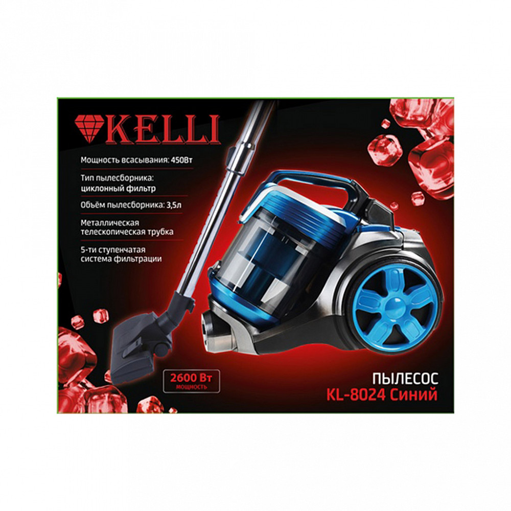 Пылесос «Kelli», пылесборник: циклонный фильтр 3,5л, дополнительная насадка, 5-ти ступенчатая система фильтрации, удобный механизм очистки, телескопическая трубка, сетевой шнур: 5м, автоматическое сматывание, низкий уровень шума, потребляемая мощност